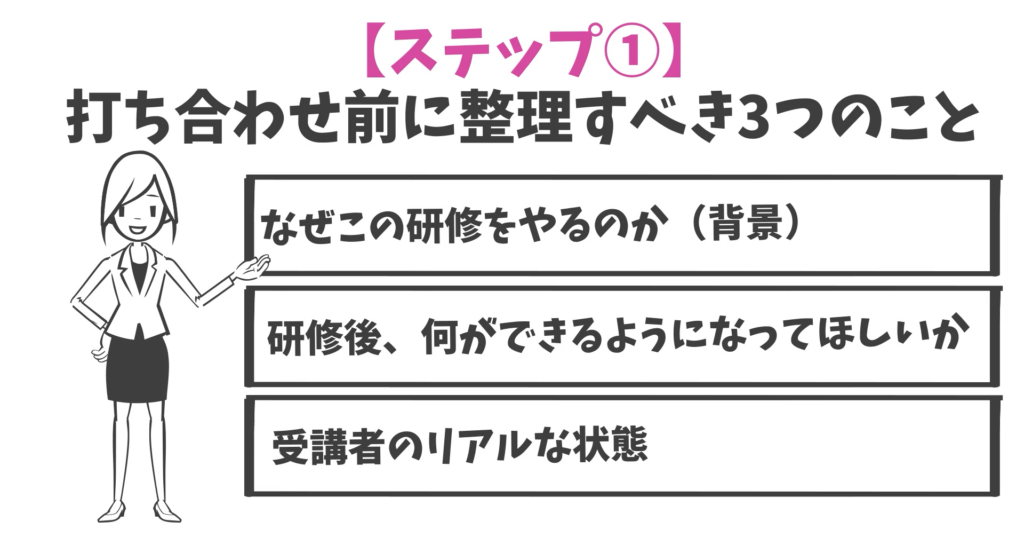 まずは、研修担当者側で次の3点を整理します。